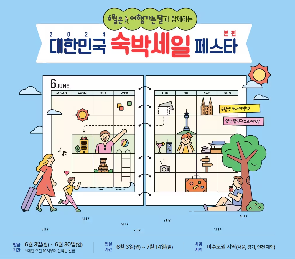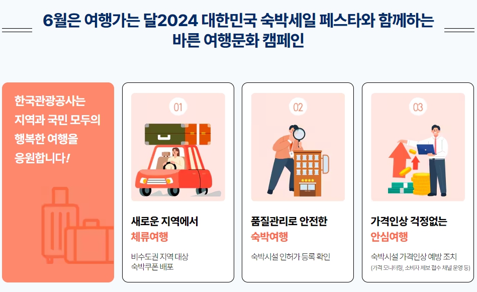 지난 5월 28일 문화체육관광부와 한국관광공사가 지원하는 숙박세일페스타가 지역특별기획전을 시작으로 진행되었고 이번 6월 3일부터는 본편이 진행되고 있습니다.